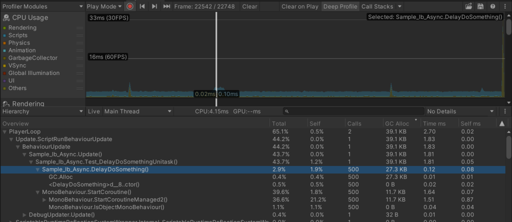 结论:经过每帧500次的调用测试,可以看出基于UniTask的Ib_Async虽然相比协程cpu耗时略高,但是在GC上有巨大的优势,在频繁调用的场景下性能稳定性更佳,这一点额外的耗时是值得的。