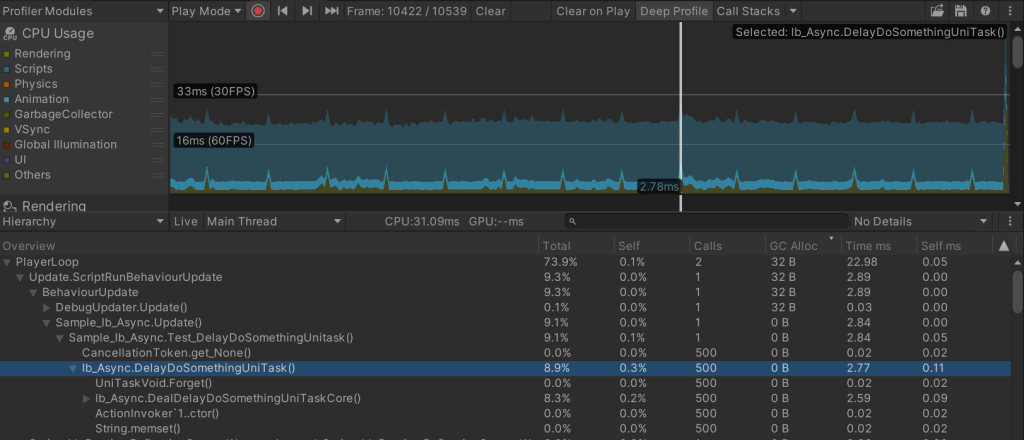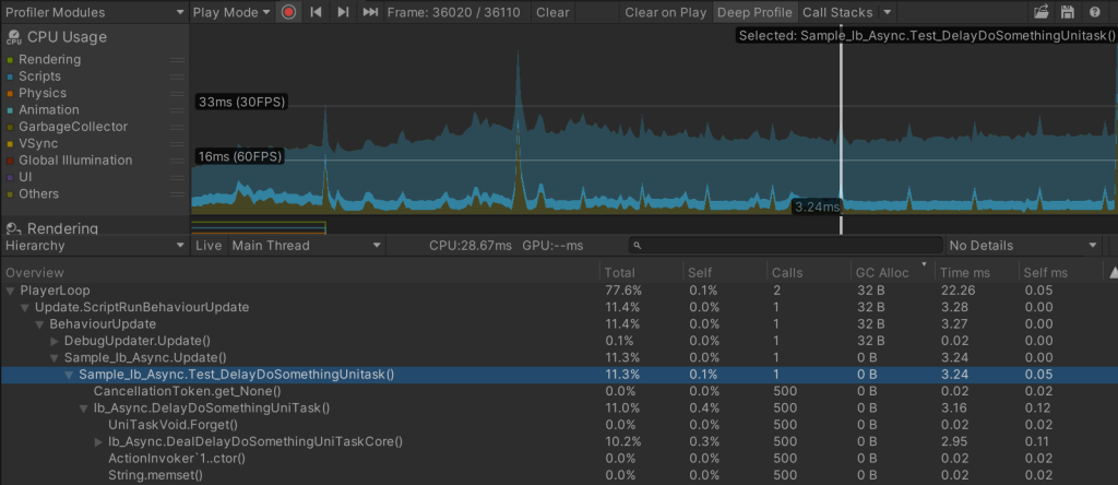 1、基于UniTask的Ib_Async。可以看到每帧调用了Ib_Async.DelayDoSomethingUniTask500次,耗时2.79ms左右,没有GC的产生。但是在IncreaseGold方法转换成Action<int>的时候产生了62.5KB的GC,为了避免这部分产生的GC我们可以在Start里提前将IncreaseGold转换成Action<int>。