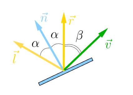 \[反射方向\vec{r} = 2\vec{n}(\vec{l} * \vec{n}) – \vec{l}\]