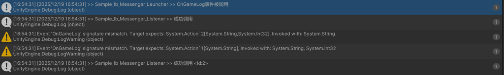 *同事件名但不同的参数类型或数量会被内部定义为两个不同的事件。同时会弹出类型或数量无法匹配的警告,只有匹配成功的才会被执行。可以看到两个同为“OnGameLog”的事件各自只被调用了一次,同时对彼此弹出了类型不匹配的警告。
