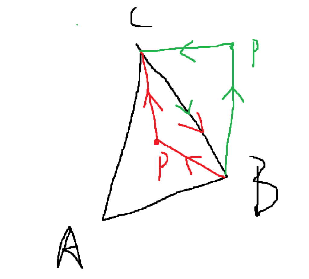 其中计算三角形面积公式是有向的。如三角形PCB,若P在直线CB的左侧,则P,C,B是顺时针的顺序,求出的面积是一个整数,而当P在直线CB的右侧时,则P,C,B是逆时针的顺序,此时面积会是一个负数。由此可知当P在三角形内部时,需要满足PCB,PAB,PAC的面积都为正。上述代码中除以了总面积,总面积是由ABC的逆时针顺序计算的,所以总面积为负数,所有的子三角形也要以逆时针的顺序计算。若子三角形面积与总面积的比值为负数,则P在三角形外。